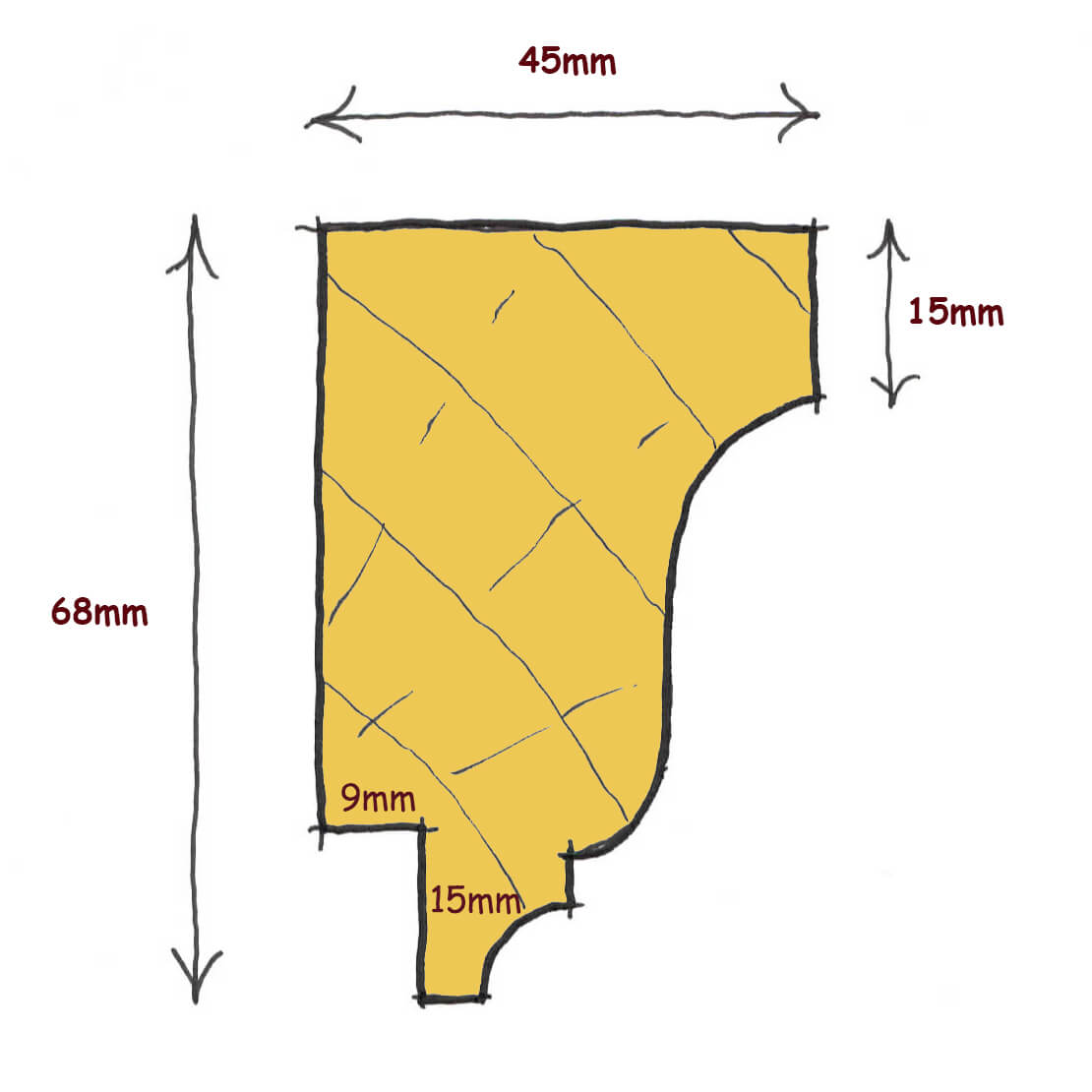 68mm high x 45mm depth (note one of the images shows an additional plank fitted to the top and painted green as an example of how or large rebated cornice moulding can be used to create a deeper shelf).